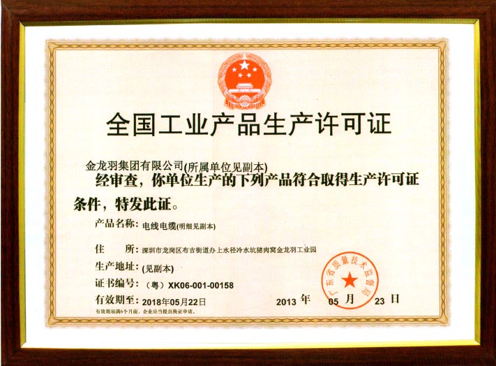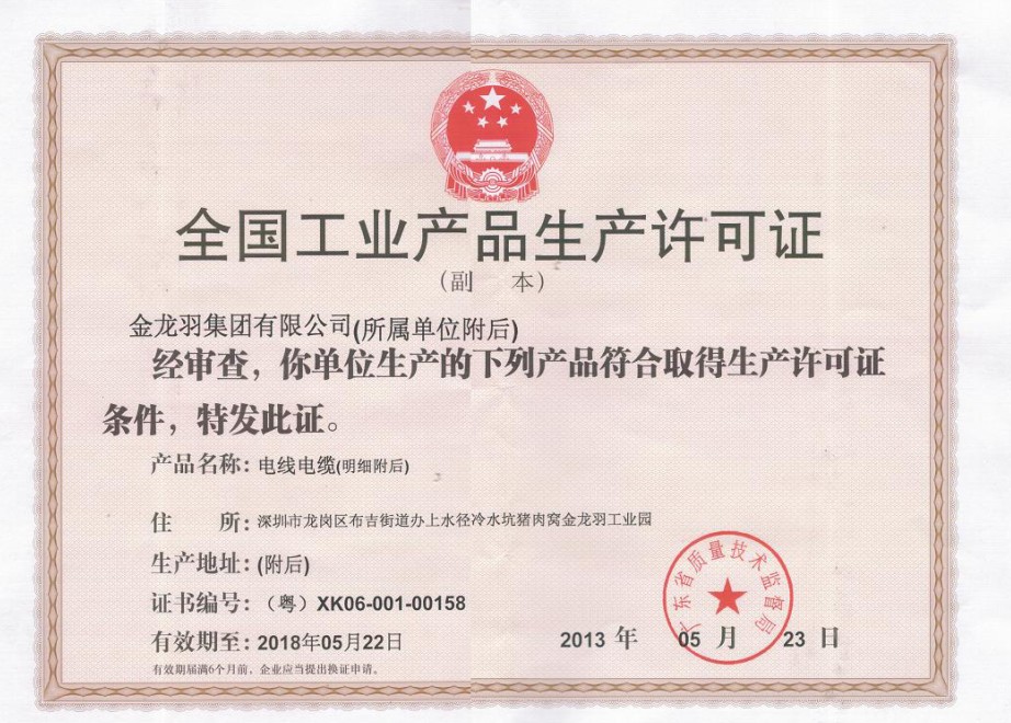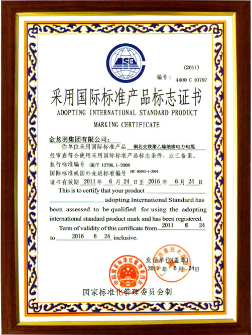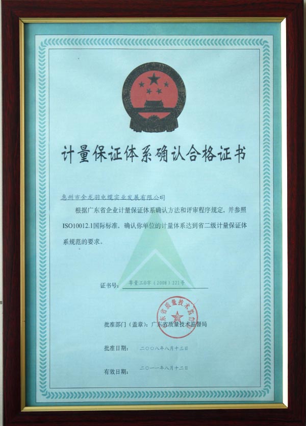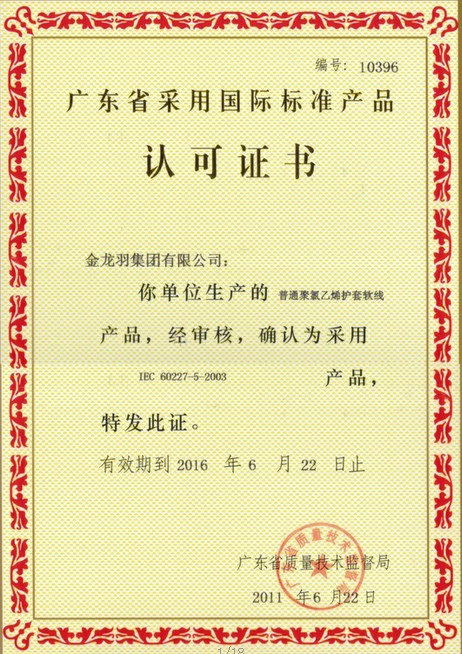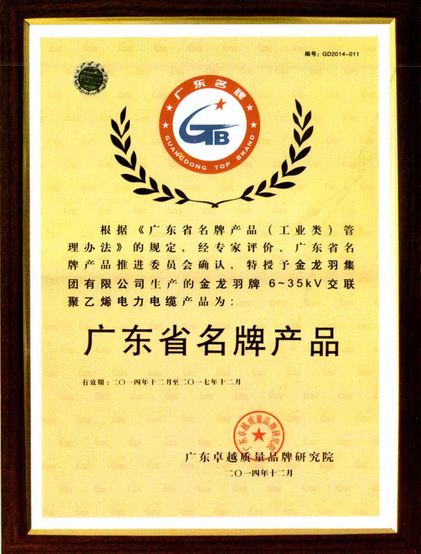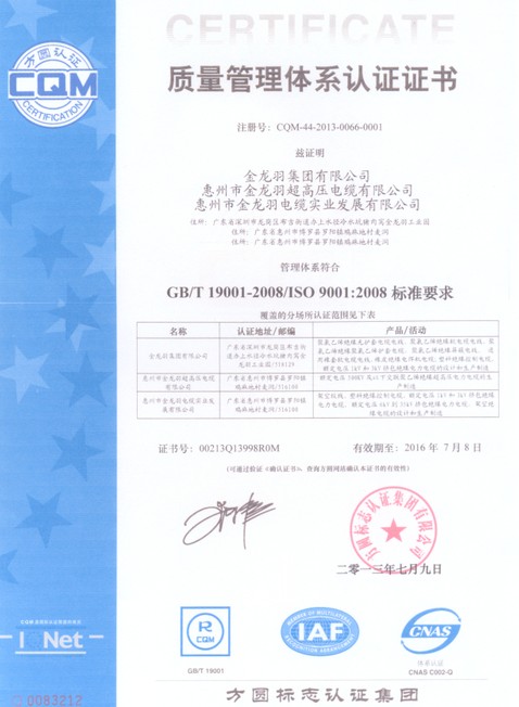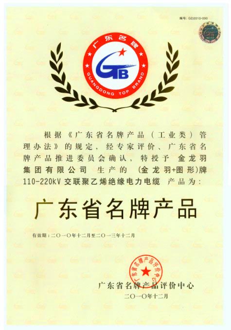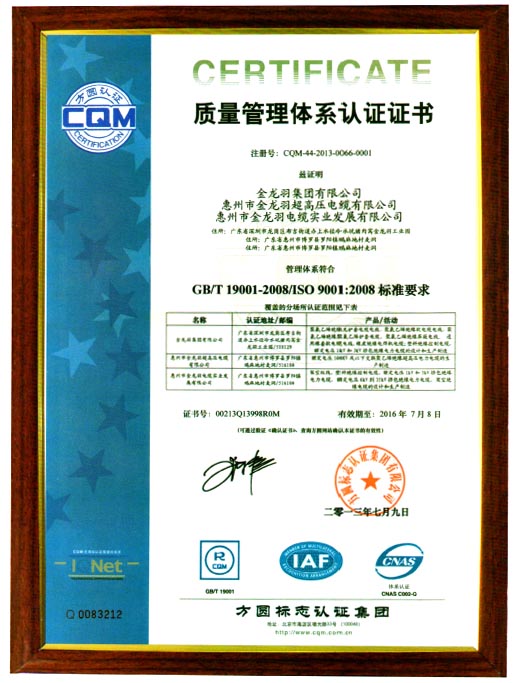 金龙羽集团股份有限公司 通过IS9001质量管理体系认证,以科学的管理和完善的检测手段,确保了向客户提供的产品合格率高, 在历年来国家、省、市等各级质量认证中心和广东省公安厅消防局等相关权威部门的认证,在市场上的占有率逐年稳步提高, 许多工程项目使用“金龙羽”牌产品,产品得到了中国人民保险公司深圳市布吉分公司的质量承保。 成为1999年至2003年深圳产品质量监督所授权深圳市电缆电线行业中可使用“质量跟踪产品”标志的企业; 1996年至2003年连续八年被深圳市质量技术监督授予“产品监检质量好企业”等荣誉称号,并被国家经济贸易委员会列入 《全国城乡电网建设与改造所需要设备产品及生产企业推荐目录》;2005年通过了二级计量保证