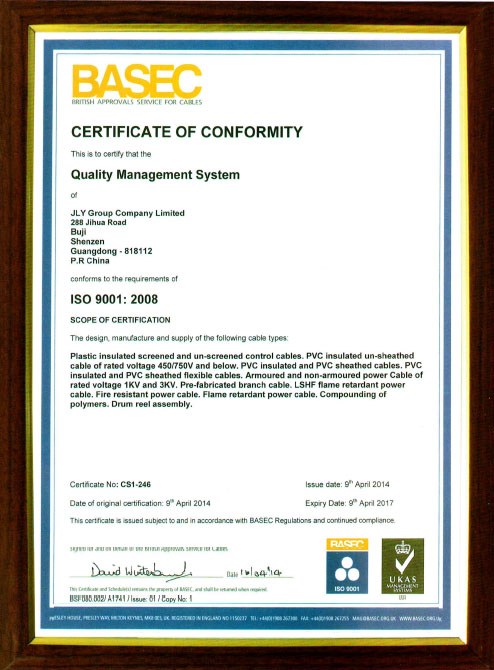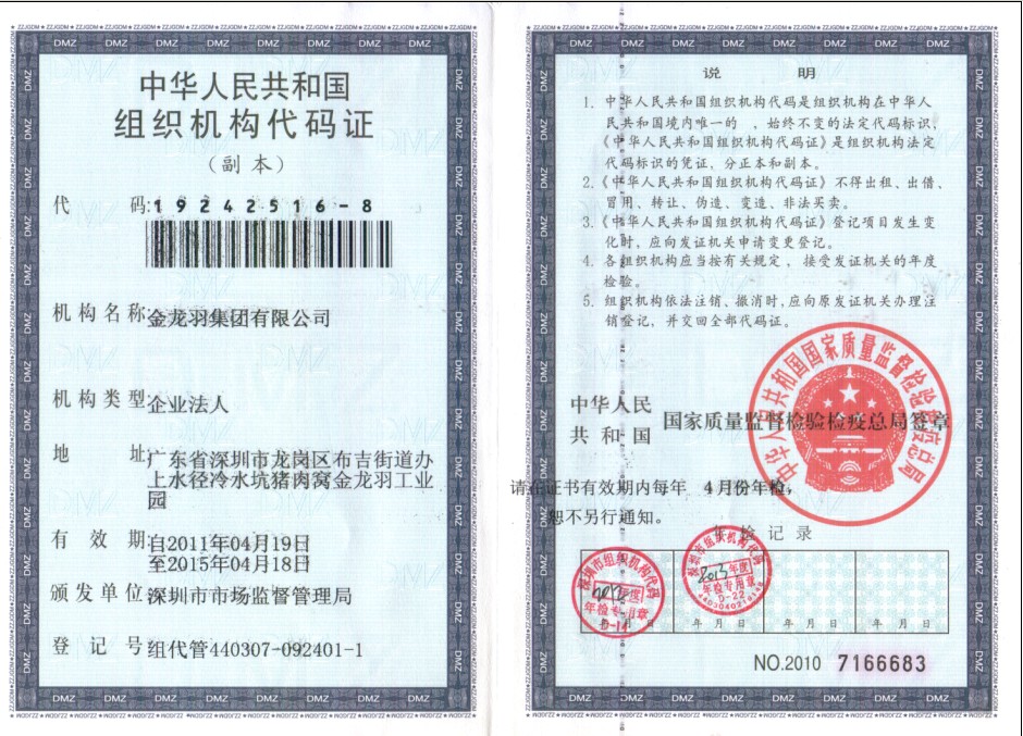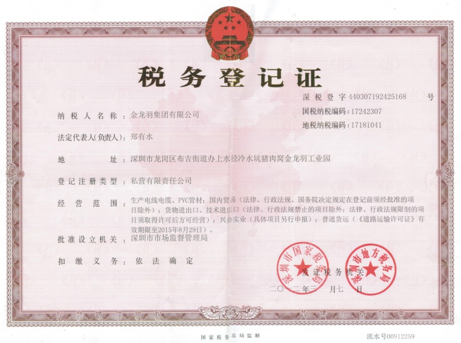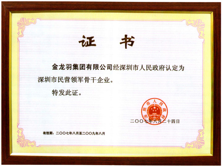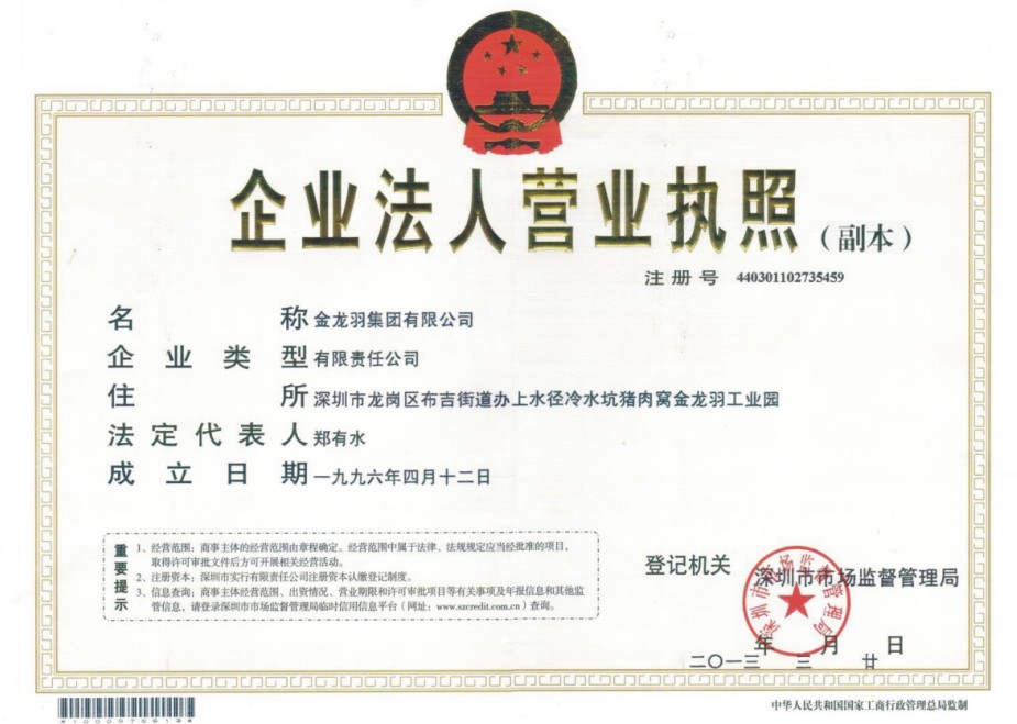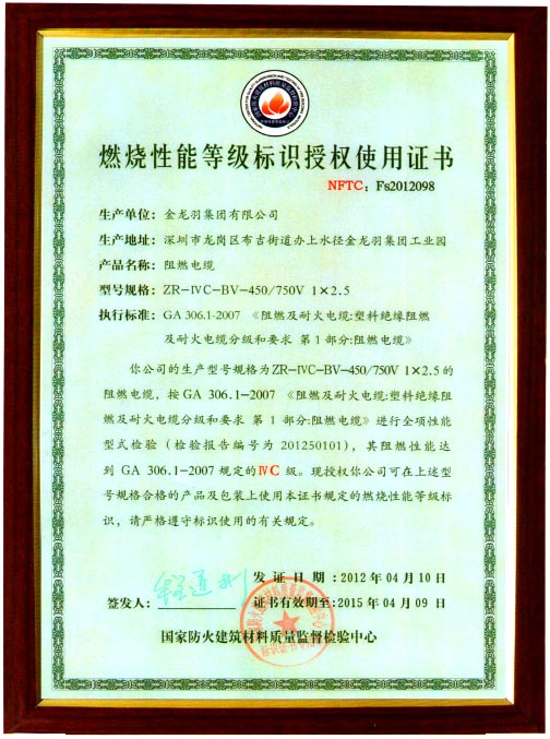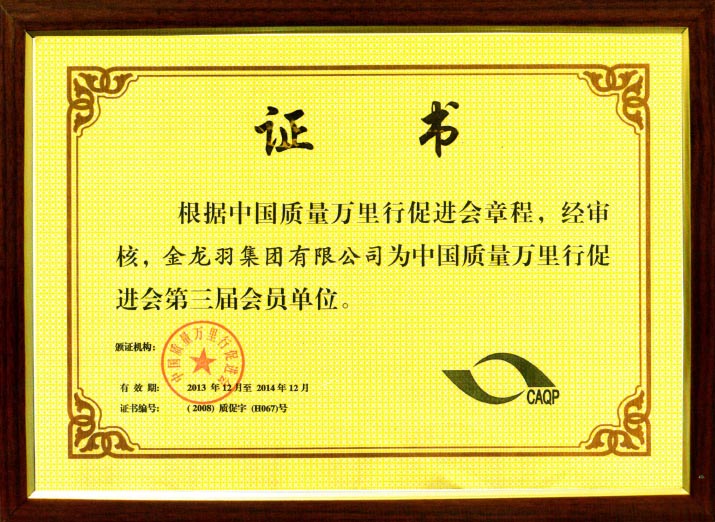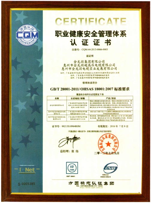 金龙羽集团股份有限公司 通过IS9001质量管理体系认证,以科学的管理和完善的检测手段,确保了向客户提供的产品合格率高, 在历年来国家、省、市等各级质量认证中心和广东省公安厅消防局等相关权威部门的认证,在市场上的占有率逐年稳步提高, 许多工程项目使用“金龙羽”牌产品,产品得到了中国人民保险公司深圳市布吉分公司的质量承保。 成为1999年至2003年深圳产品质量监督所授权深圳市电缆电线行业中可使用“质量跟踪产品”标志的企业; 1996年至2003年连续八年被深圳市质量技术监督授予“产品监检质量好企业”等荣誉称号,并被国家经济贸易委员会列入 《全国城乡电网建设与改造所需要设备产品及生产企业推荐目录》;2005年通过了二级计量保证
